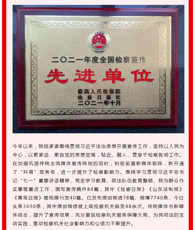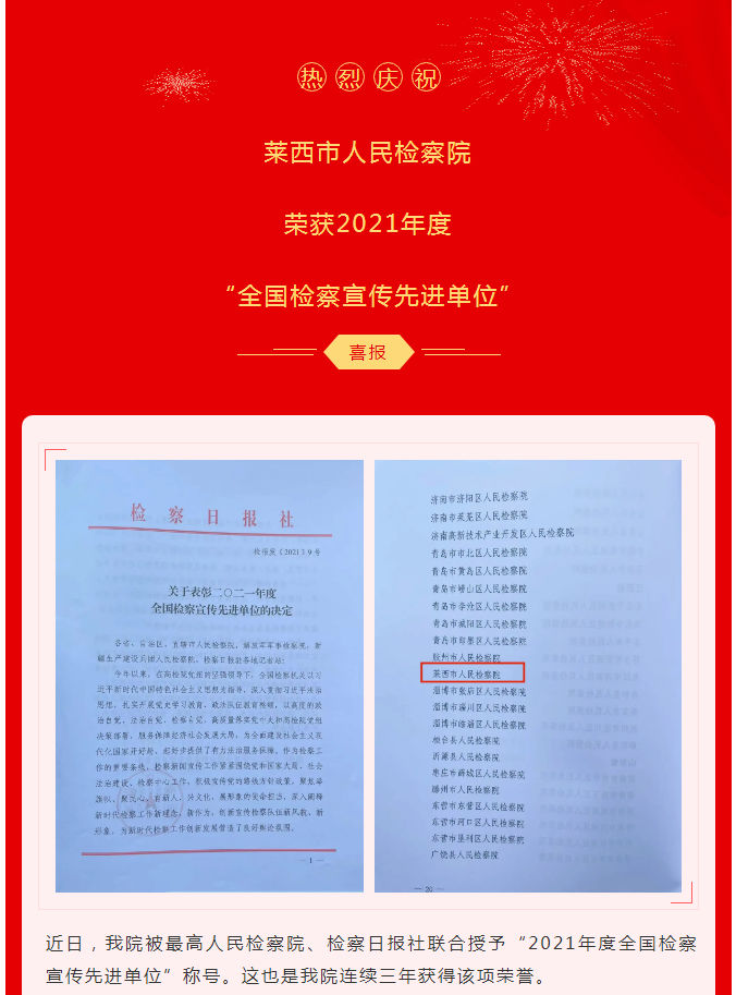 【喜报】莱西市人民检察院荣获2021年度“全国检察宣传先进单位”