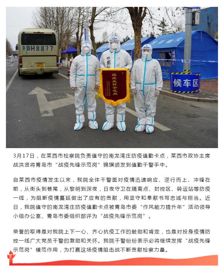 莱西市检察院值勤卡点荣获青岛市“战疫先锋示范岗”称号