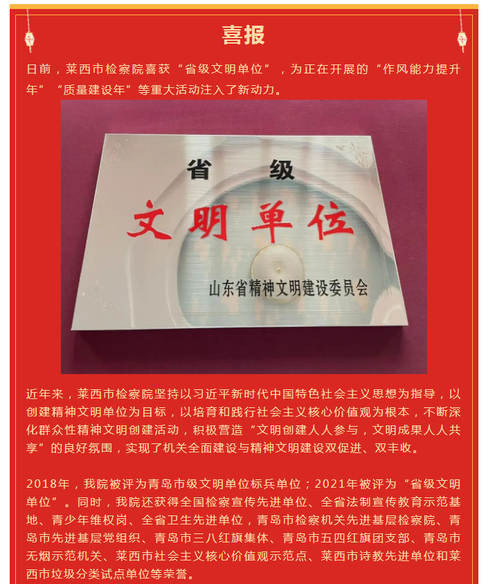 【喜报】莱西市检察院荣获“省级文明单位”