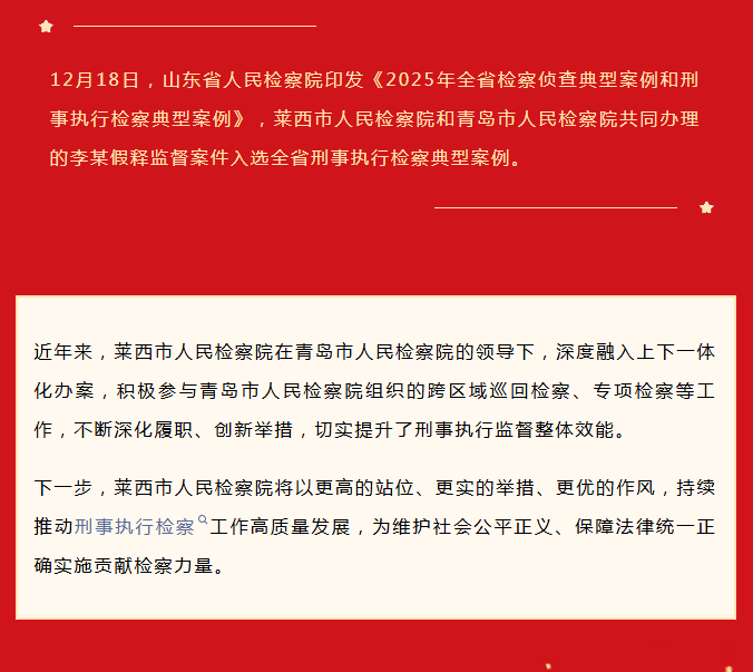 【喜报】莱西市人民检察院与青岛市人民检察院共同办理的一起案件入选全省刑事执行检察典型案例