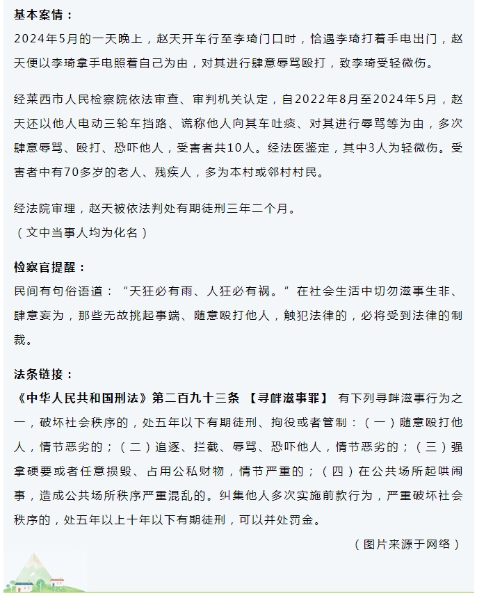 【莱检说法】第115期:无事生非随意殴打他人被判三年二个月